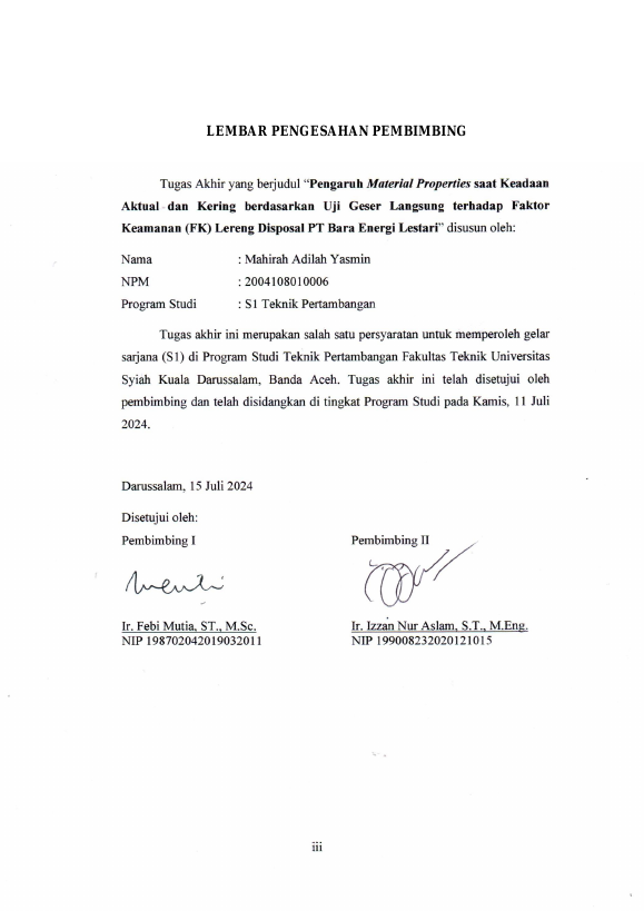 Mahirah Adilah Yasmin, PENGARUH MATERIAL PROPERTIES SAAT KEADAAN AKTUAL DAN KERING BERDASARKAN UJI GESER LANGSUNG TERHADAP FAKTOR KEAMANAN (FK) LERENG DISPOSAL PT BARA ENERGI LESTARI. Banda Aceh Fakultas Teknik,2024