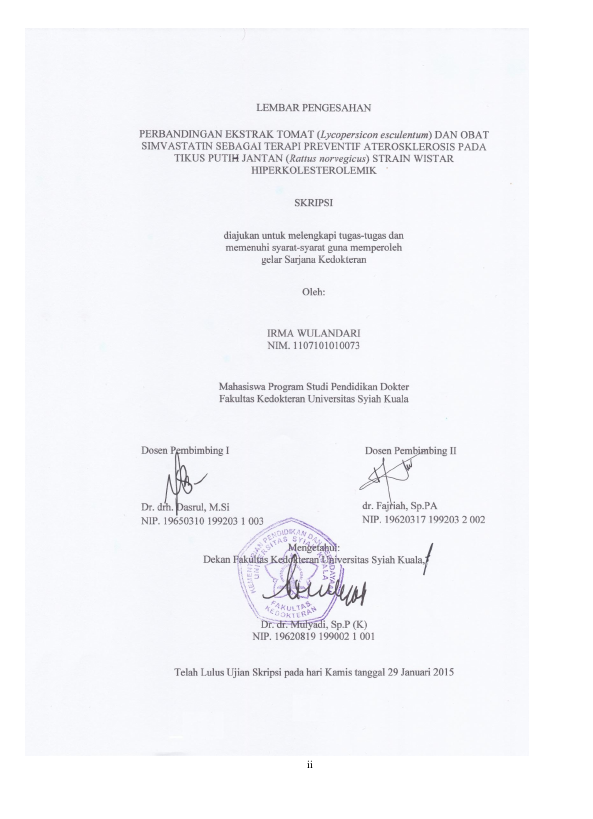 Baca Juga : PERBANDINGAN EKSTRAK TOMAT (LYCOPERSICON ESCULENTUM) DAN OBAT SIMVASTATIN SEBAGAI TERAPI PREVENTIF ATEROSKLEROSIS PADA TIKUS PUTIH JANTAN (RATTUS NORVEGICUS) STRAIN WISTAR HIPERKOLESTEROLEMIK (irma wulandari, 2015)