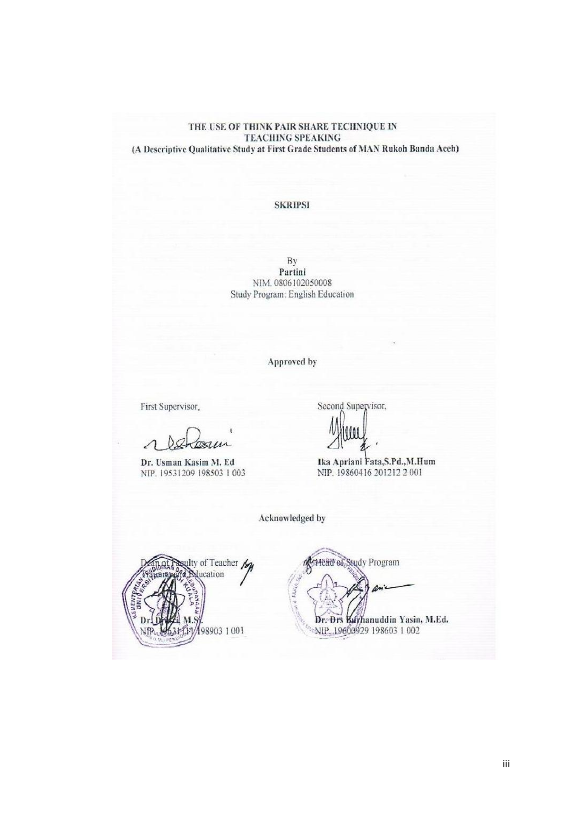 Baca Juga : TEACHING SPEAKING BY USING THINK PAIR SHARE TECHNIQUE (AN EXPERIMENTAL RESEARCH AT THE SECOND GRADE STUDENTS OF SMP NEGERI 14 BANDA ACEH) (Rika Amila Desta, 2016)