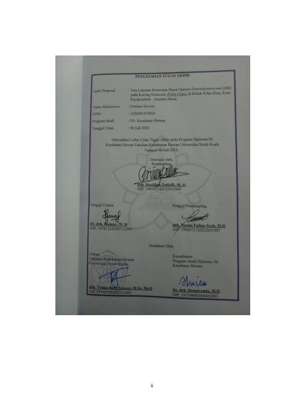 Baca Juga : TATA LAKSANA PERAWATAN PASCA OPERASI OVARIOHYSTERECOMI (OH) PADA KUCING DOMESTIK (FELIS CATUS) KLINIK KIHA – ZIMA, KOTA PAYAKUMBUH-SUMATRA BARAT. (Febdina Novela, 2024)