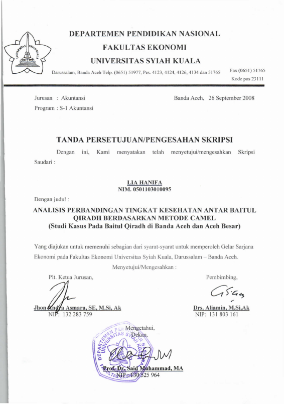 Lia Hanifa, ANALISIS PERBANDINGAN TINGKAT KESEHATAN ANTAR BAITUL QIRADH BERDASARKAN METODE CAMEL (STUDI KASUS PADA BAITUL QIRADH DI BANDA ACEH DAN ACEH BESAR). Banda Aceh Fakultas Ekonomi,2008