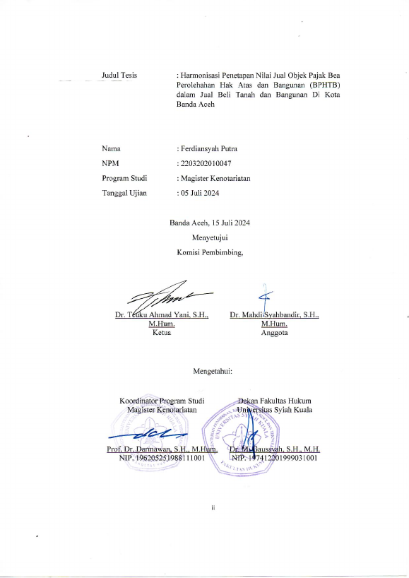 Ferdiansyah Putra, HARMONISASI PENETAPAN NILAI JUAL OBJEK PAJAK BEA PEROLEHAN HAK ATAS TANAH DAN BANGUNAN (BPHTB) DALAM JUAL-BELI TANAH DAN BANGUNAN DI KOTA BANDA ACEH. Banda Aceh Fakultas Hukum Magister Kenotariatan,2024