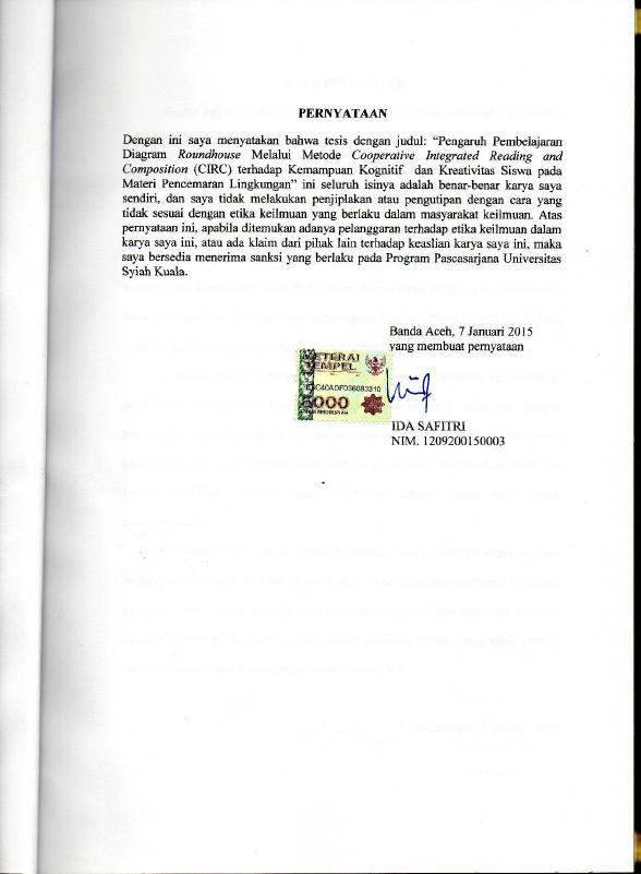 IDA SAFITRI, PENGARUH PEMBELAJARAN DIAGRAM ROUNDHOUSE MELALUI METODE COOPERATIVE INTEGRATED READING AND COMPOSITION (CIRC) TERHADAP KEMAMPUAN KOGNITIF DAN KREATIVITAS SISWA PADA MATERI PENCEMARAN LINGKUNGAN. Banda Aceh Fakultas Keguruan dan Ilmu Pendidikan,2015