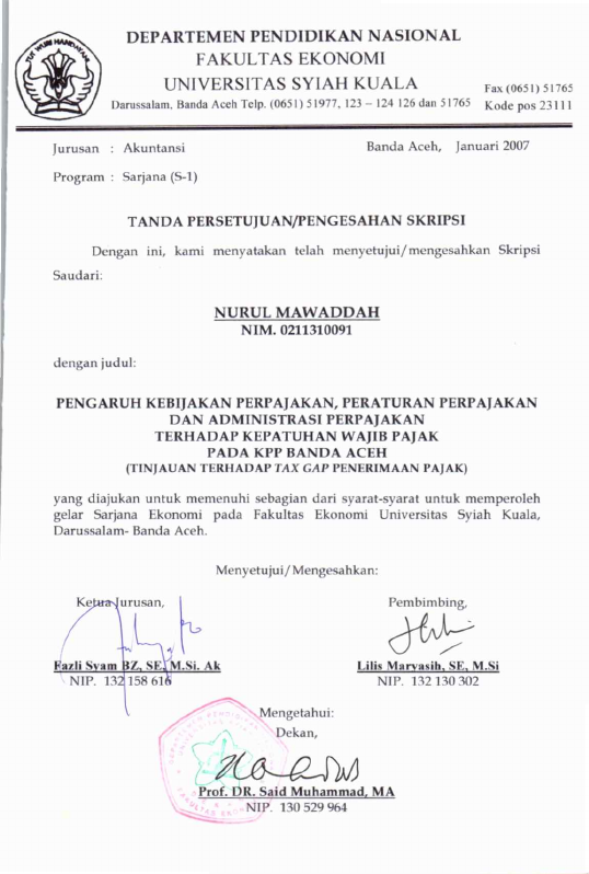 Nurul Mawaddah, PENGARUH KEBIJAKAN PERPAJAKAN, PERATURAN PERPA.JAKAN DAN ADMINISTRASI PERPAJAKANRNTERHADAP KEPATUHAN WA.JIB PAJAK PADA KPP BANDA ACEH (TIN.JAUAN TERHADAP TAX GAP PENF.RIMAAN PA.JAK). Banda Aceh Fakultas Ekonomi,2007