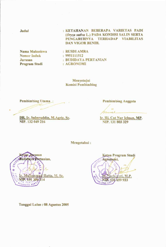 Rusdi Amra, KETAHANAN BEBERAPA VARIETAS PADI (ORYZA SATIVA L.) PADA KONDISI SALIN SERTA PENGARUHNYA TERHADAP VIABILITAS DAN VIGOR BENIH. Banda Aceh Fakultas Pertanian,