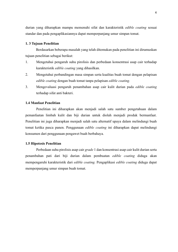 M. BAGAS HERIANSYAH, PENGARUH SUHU PIROLISIS DAN KONSENTRASI ASAP CAIR KULIT DURIAN TERHADAP KUALITAS EDIBLE COATING DARI PATI BIJI DURIAN SERTA APLIKASINYA PADA BUAH TOMAT (SOLANUM LYCOPERSICUM L.). Banda Aceh Fakultas Pertanian (S1),2024