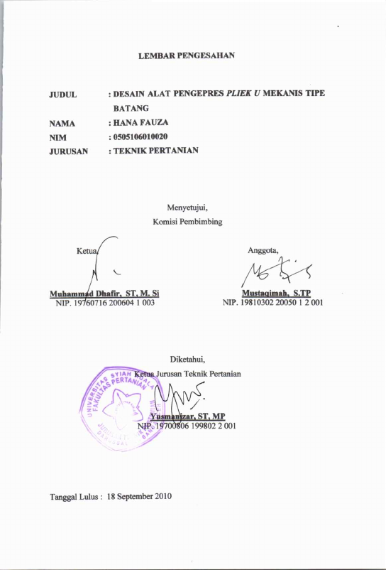 Hana Fauza, DESAIN ALAT PENGEPRES PLIEK U MEKANIS TIPE BATANG. Banda Aceh Fakultas Pertanian,2010