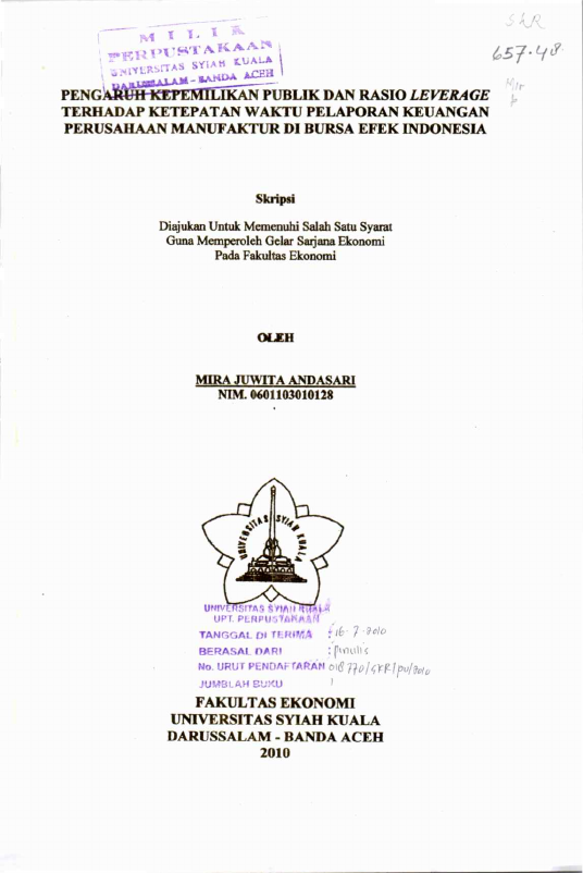 Mira Juwita Andasari, PENGARUH KEPEMILIKAN PUBLIK DAN RASIO LEVERAGE TERBADAP KETEPATAN WAKTU PELAPORAN KEUANGAN PERUSAHAAN MANUFAKTUR DI BURSA EFEK INDONESIA. Banda Aceh Fakultas Ekonomi,2010