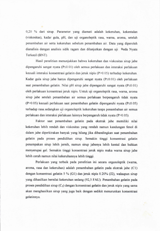 Syarifah Inayah, PENGARUH SAAT PENAMBAHAN GELATIN DAN KONSENTRASI GELATIN SERTA KONSENTRASI JERUK NIPIS TERHADAP MUTU SIRUP JAHE. Banda Aceh Fakultas Pertanian,2005
