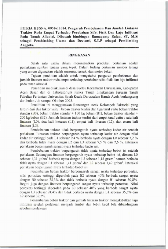 Baca Juga : PENGARUH TEKANAN ANGIN PADA BAN TRAKTOR DAN JUMLAH LINTASAN TRAKTOR RODA EMPAT TERHADAP PERUBAHAN SIFAT FISIK DAN LAJU INFILTRASI PADA TANAH ALLUVIAL (Yeni Nurul Huda, 2024)