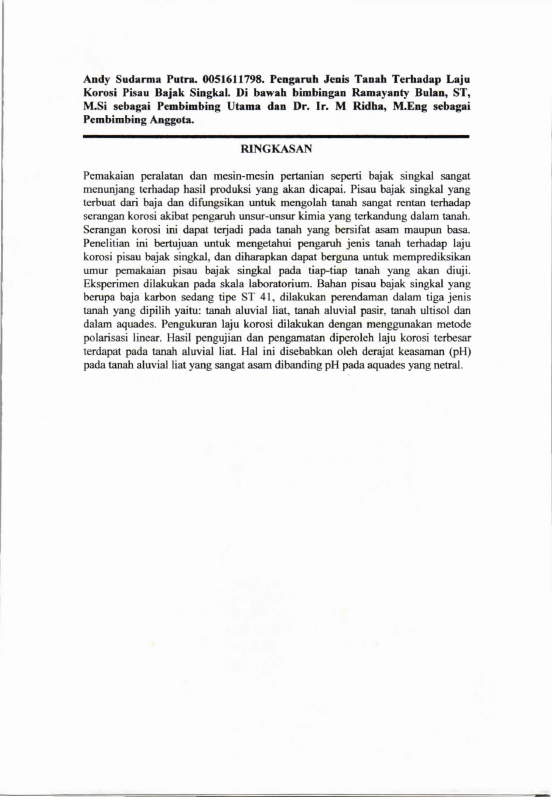 Andy Sudarma Putra, PENGARUH JENIS TANAH TERBADAP LAJU KOROSI PISAU BAJAK SINGKAL. Banda Aceh Fakultas Pertanian,2005