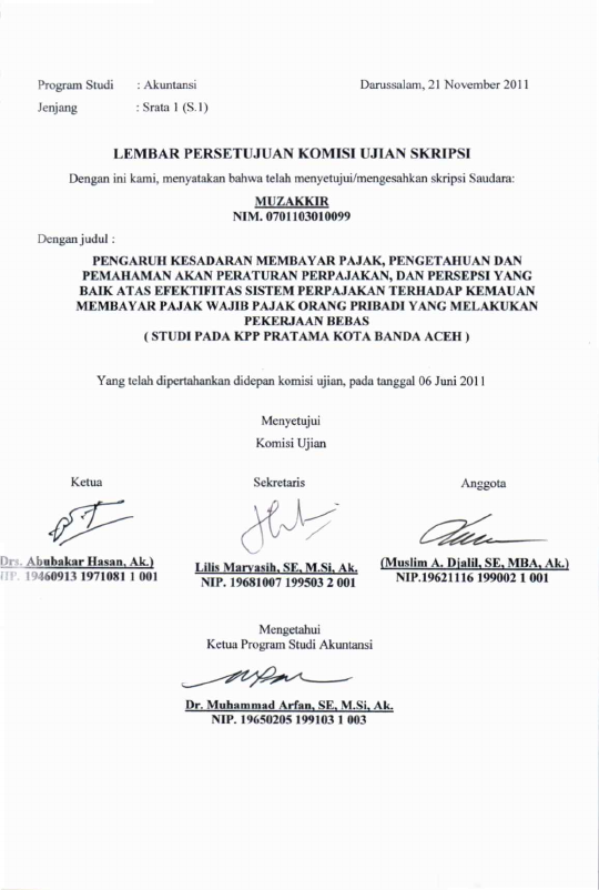 PENGARUH KESADARAN MEMBAYAR PAJAK, PENGETAHUAN DAN PEMAHAMAN AKAN PERATURAN PERPAJAKAN, DAN PERSEPSI YANG BAIK ATAS EFEKTIFITAS SISTEM PERPAJAKAN TERHADAP KEMAUAN MEMBAYAR PAJAK WAJIB PA.JAK ORANG PRIBADI YANG MELAKUKAN PEKERJAAN BEBAS ( STUDI PADA KPP PRATAMA KOTA BANDA ACEH ). Banda Aceh Fakultas Ekonomi,2011
