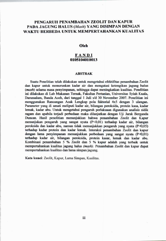 Fandi, PENGARUH PENAMBAHAN ZEOLIT DAN KAPUR PADA JAGUNG HALUS (MASH) YANG DISIMPAN DENGAN WAKTU BERBEDA UNTUK MEMPERTAHANKAN KUALITAS. Banda Aceh Fakultas Pertanian,2008