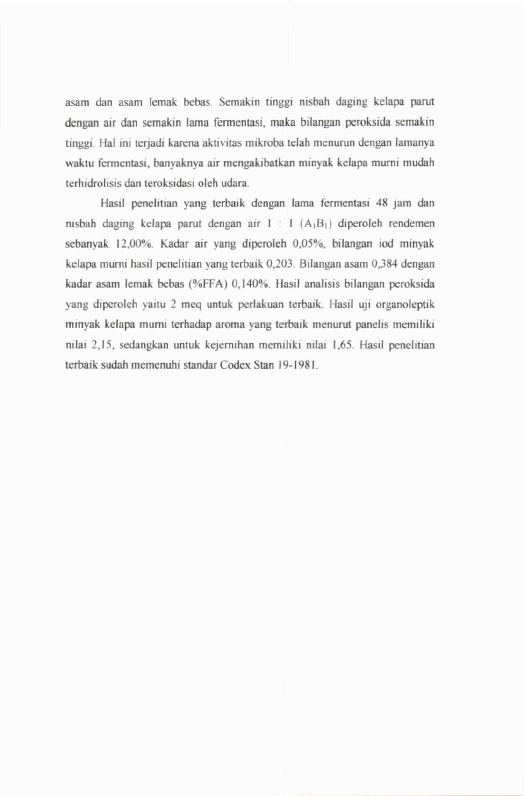 Nurul Fatma Rachman, PENGARUH NISBAH DAGING KELAPA PARUT DENGAN AIR DAN LAMA FERMENTASI PADA PROSES PEMBUÄTAN MINYAK KELAPA MURNI DENGAN MENGGUNAKAN RAGI ROTI. Banda Aceh Fakultas Pertanian,2006