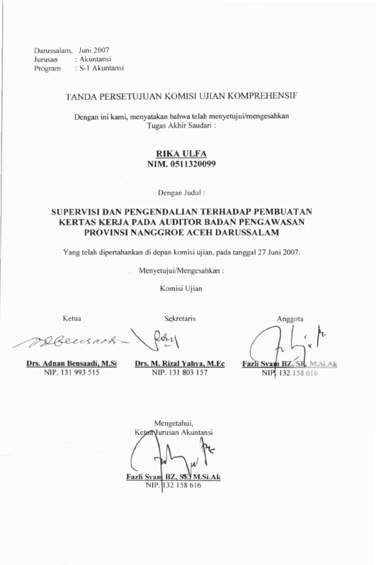 Rika Ulfa, SUPERVISI DAN PENGENDALIAN TERHADAP PEMBUATAN KERTAS KERJA PADA AUDITOR BADAN PENGAWASAN DAERAH PROVINSI NANGGROE ACEH DARUSSALAM. Banda Aceh Fakultas Ekonomi,2007