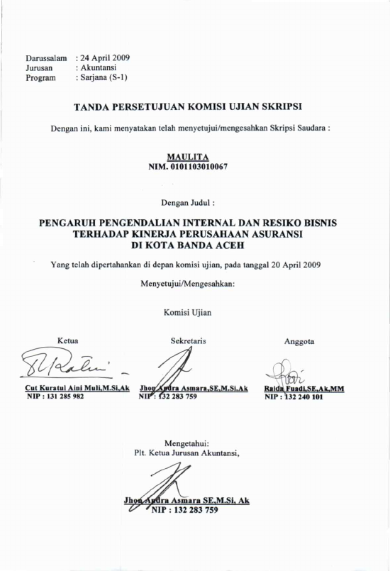 Maulita, PENGARUH PENGENDALIAN INTERNAL DAN RESIKO BISNIS TERHADAP KINERJA PERUSAHAAN ASURANSI DI KOTA BANDA ACEH. Banda Aceh Fakultas Ekonomi,2009
