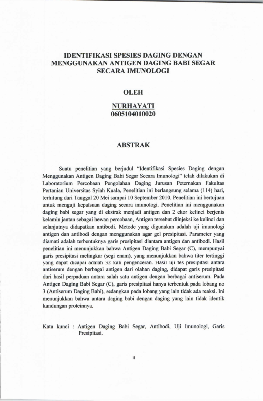 Nurhayati, IDENTIFIKASI SPESIES DAGING DENGAN MENGGUNAKAN ANTIGEN DAGING BABI SEGAR SECARA IMUNOLOGI. Banda Aceh Fakultas Pertanian,2011