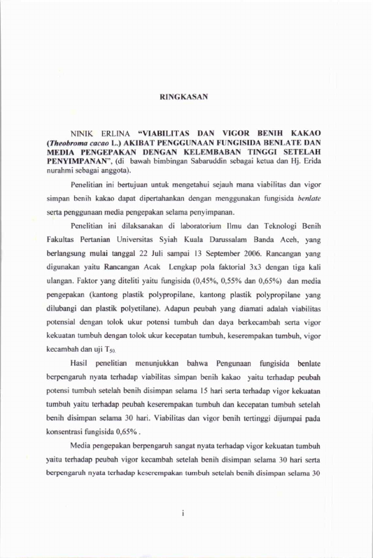 Ninik Erlina, VIABILITAS DAN VIGOR BENIH KAKAO (LHEOBROMA CACAO L) AKIBAT PENGGUNAAN FUNGISIDA BENLATE DAN MEDIA PENGEPAKAN DENGAN KELEMBABAN TINGGI SETELAH PENYIMPANAN. Banda Aceh Fakultas Pertanian,2007