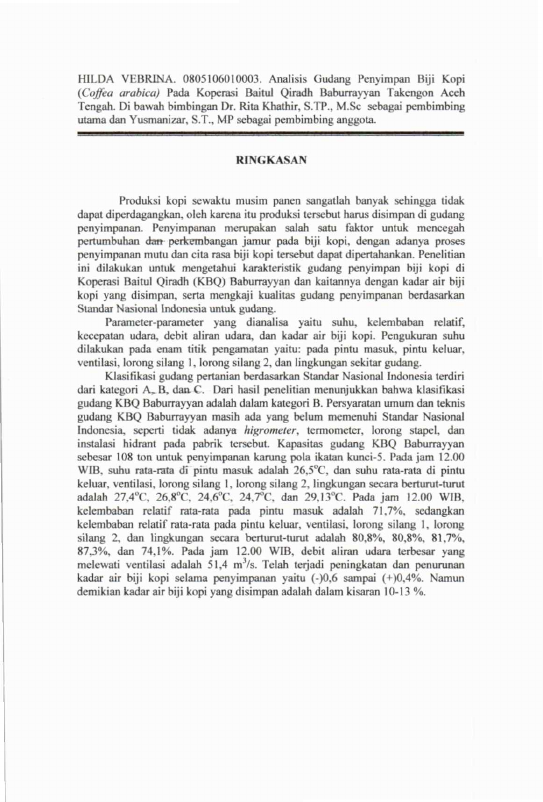Hilda Vebrina, ANALISIS GUDANG PENYIMPAN BIJI KOPI (COFFEA ARABICA) PADA KOPERASI BAITUL QIRADH BABURRAYYAN TAKENGON ACEH TENGAH. Banda Aceh Fakultas Pertanian,