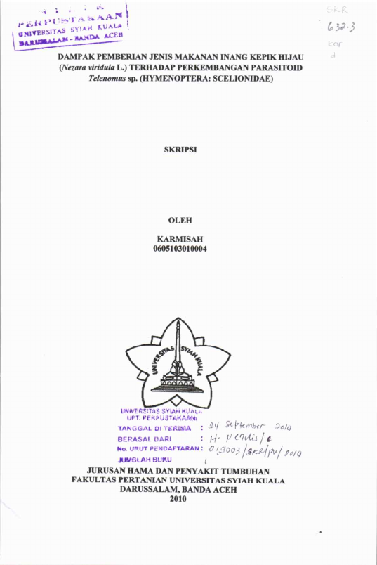 Karmisah, DAMPAK PEMBERIAN JENIS MAKANAN INANG KEPIK HIJAU (NEZAM VIRIDULA L.) TERHADAP PERKEMBANGAN PARASITOIDRNTELENOMUS SP. (HYMENOPTERA: SCELIONIDAE). Banda Aceh Fakultas Pertanian,2010