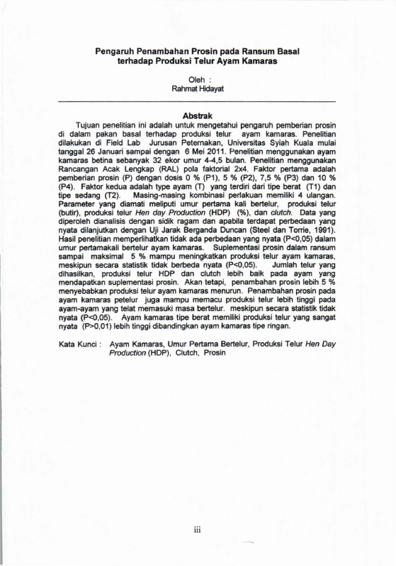 Rahmat Hidayat, PENGARUH PENAMBAHAN PROSIN PADA RANSUM BASAL TERHADAP PRODUKSI TELUR AYAM KAMARAS. Banda Aceh Fakultas Pertanian,2012