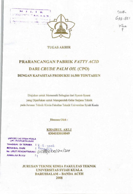 Khairul Akli, PRARANCANGAN PABRIK FATTY ACID DA:RI CRUDE PALM OIL (CPO) DENGAN KAPASITAS PRODUKSI 16.500 TON/TAHUN. Banda Aceh Fakultas Teknik,2008