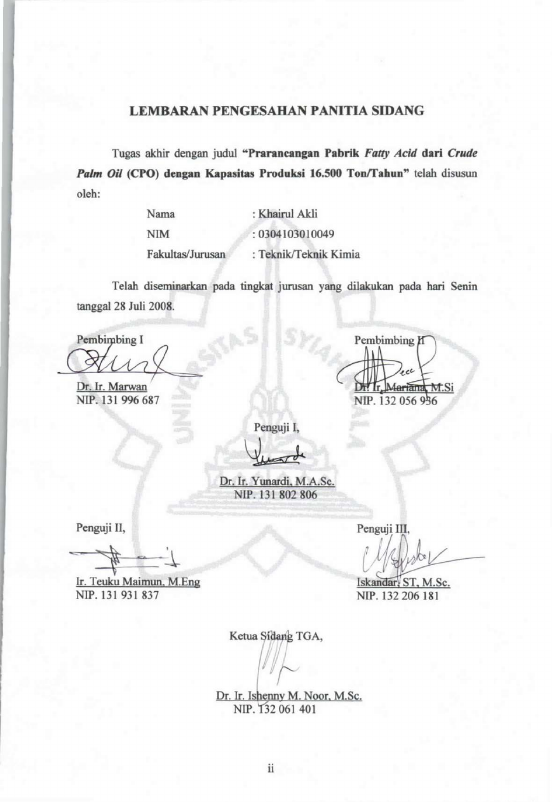 Khairul Akli, PRARANCANGAN PABRIK FATTY ACID DA:RI CRUDE PALM OIL (CPO) DENGAN KAPASITAS PRODUKSI 16.500 TON/TAHUN. Banda Aceh Fakultas Teknik,2008