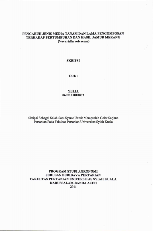 Yulia, PENGARUH JENIS MEDIA TANAM DAN LAMA PENGOMPOSAN TERHADAP PERTUMBUHAN DAN HASIL JAMUR MERANGRN(OLVARIELLA VOLVACEAE). Banda Aceh Fakultas Pertanian,2011