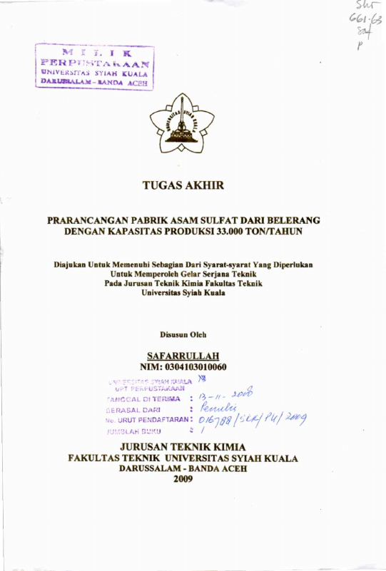 Safarrullah, PRARANCANGAN PABRIK ASAM SULFAT DARI BELERANG DENGAN KAPASITAS PRODUKSI 33.000 TON/TAHUN. Banda Aceh Fakultas Teknik,2009