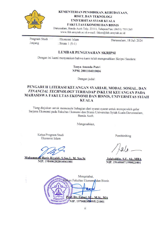 TASYA ANANDA PUTRI, PENGARUH LITERASI KEUANGAN SYARIAH, MODAL SOSIAL, DAN FINANCIAL TECHNOLOGY TERHADAP INKLUSI KEUANGAN PADA MAHASISWA FAKULTAS EKONOMI DAN BISNIS, UNIVERSITAS SYIAH KUALA. Banda Aceh Fakultas Ekonomi Islam,2024