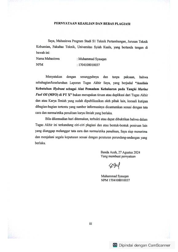 MUHAMMAD SYAUQAN, ANALISI KEBUTUHAN HYDRANT SEBAGAI ALAT PEMADAM KEBAKARAN PADA TANGKI MARINE FUEL OIL (MFO) DI PT X. Banda Aceh Fakultas Teknik (S1),2024