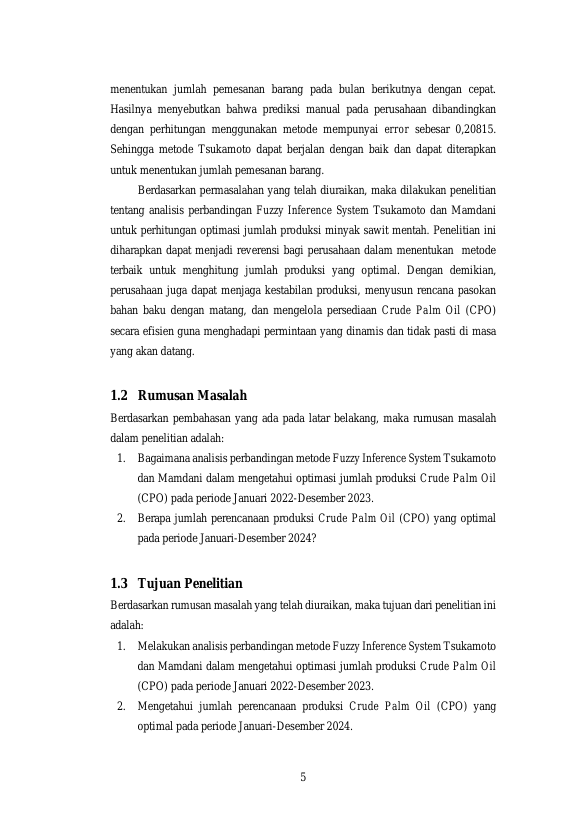 RIDHATUL FIKRI, ANALISIS PERBANDINGAN FUZZY TSUKAMOTO DAN MAMDANI UNTUK PERHITUNGAN OPTIMASI JUMLAH PRODUKSI MINYAK SAWIT MENTAH (STUDI KASUS: PT. PERKEBUNAN NUSANTARA 1 PKS COT GIREK). Banda Aceh Teknik Mesin dan Industri,2024
