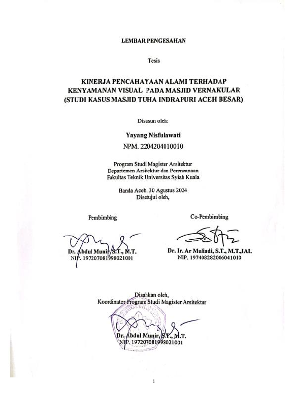 Yayang Nisfulawati, EVALUASI PENCAHAYAAN ALAMI TERHADAP KENYAMANAN VISUAL PADA MASJID VERNAKULAR (STUDI KASUS : MASJID TUHA INDRAPURI ACEH BESAR). Banda Aceh Program Studi Magister Arsitektur,