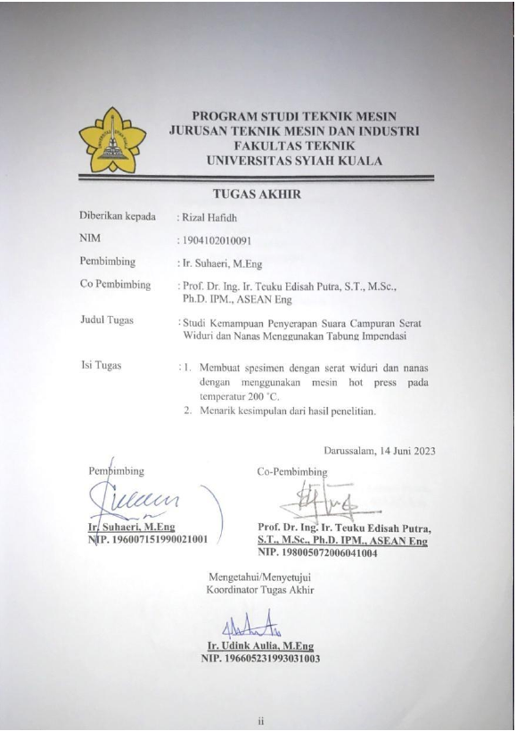 RIZAL HAFIDH, STUDI KEMAMPUAN PENYERAPAN SUARA CAMPURAN SERAT WIDURI DAN NANAS MENGGUNAKAN TABUNG IMPENDASI. Banda Aceh Teknik Mesin dan Industri,2024