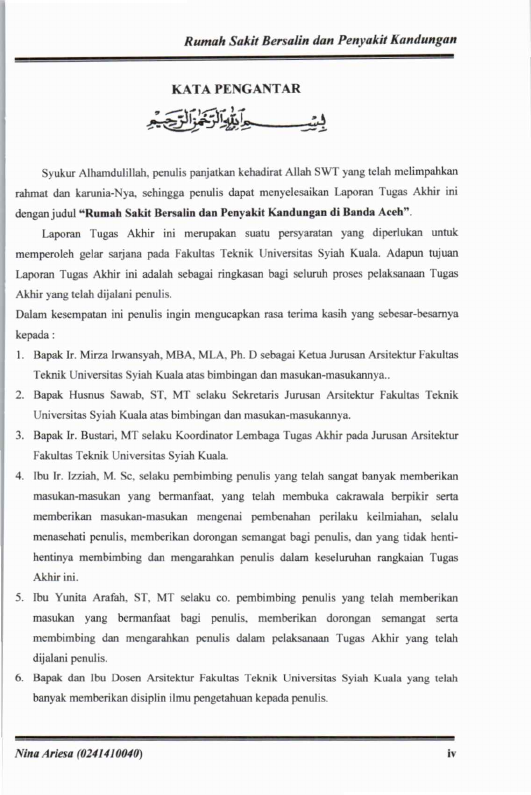 Nina Ariesa, RUMAH SAKIT BERSALIN DAN PENYAKIT KANDUNGAN DI BANDA ACEH (TEMA : ARSITEKTUR TROPIS). Banda Aceh Fakultas Teknik,2008