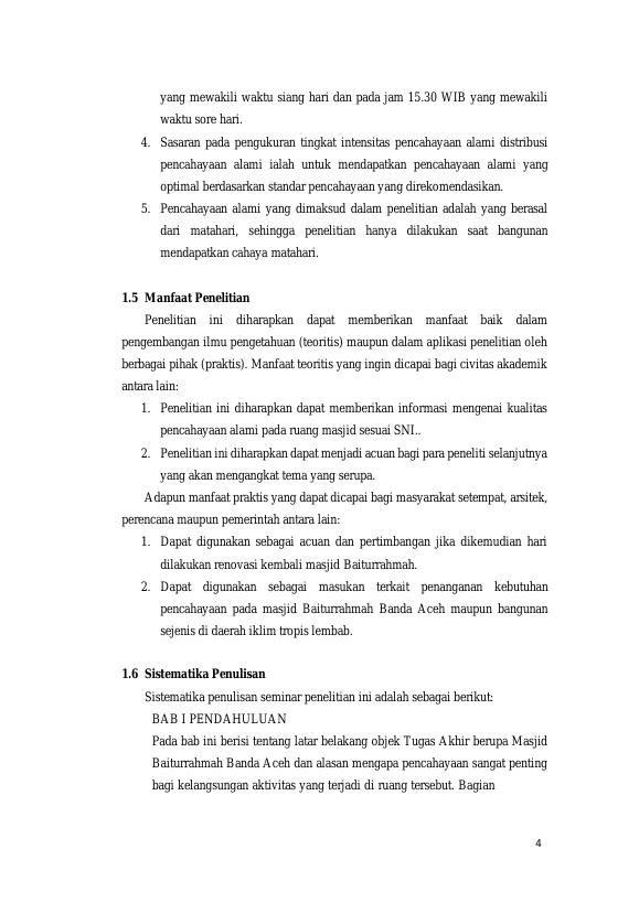 Muhammad Alfarizi, KAJIAN PENERAPAN PENCAHAYAAN ALAMI PADA BANGUNAN MASJID (STUDI KASUS : MASJID BAITURRAHMAH DI BANDA ACEH). Banda Aceh Fakultas Teknik Arsitektur,2024