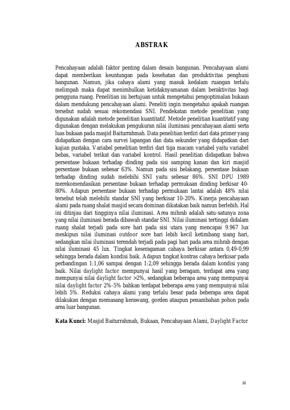 Muhammad Alfarizi, KAJIAN PENERAPAN PENCAHAYAAN ALAMI PADA BANGUNAN MASJID (STUDI KASUS : MASJID BAITURRAHMAH DI BANDA ACEH). Banda Aceh Fakultas Teknik Arsitektur,2024