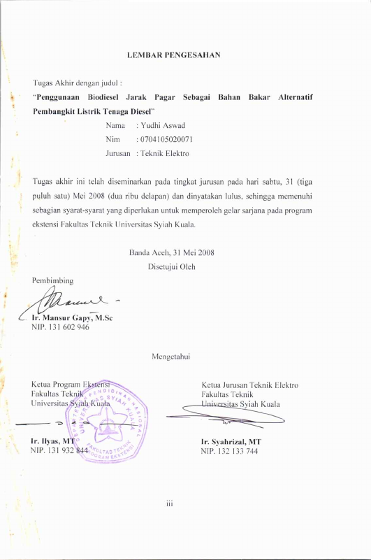 Yudhi Aswad, PENGGUNAAN BIODIESEL JARAK PAGAR SEBAGAI BAHAN BAKAR ALTERNATIF PEMBANGKIT LISTRIK TENAGA DIESEL. Banda Aceh Fakultas Teknik,2008
