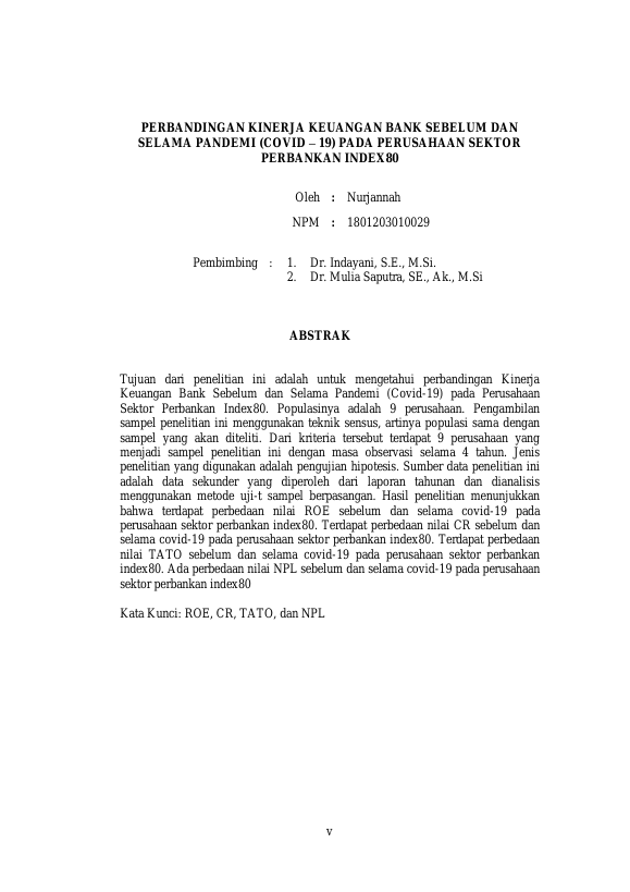 Nurjannah, PERBANDINGAN KINERJA KEUANGAN BANK SEBELUM DAN SELAMA PANDEMI (COVID – 19) PADA PERUSAHAAN SEKTOR PERBANKAN INDEX80. Banda Aceh Program Studi Magister Akuntansi,2024