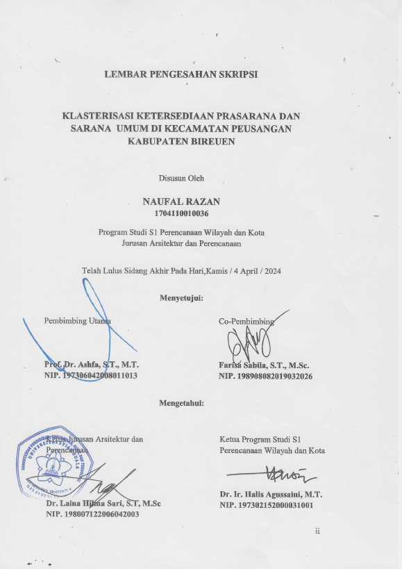 NAUFAL RAZAN, KLASTERISASI KETERSEDIAAN PRASARANA DAN SARANA UMUM DI KECAMATAN PEUSANGAN, KABUPATEN BIREUEN. Banda Aceh Fakultas Teknik Arsitektur,2024
