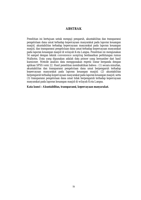 Syaifullah, PENGARUH AKUNTABILITAS DAN TRANSPARANSI PENGELOLAAN DANA UMAT TERHADAP KEPERCAYAAN MASYARAKAT PADA LAPORAN KEUANGAN MASJID (STUDI PADA MASJID DI WILAYAH KOTA LANGSA). Banda Aceh Fakultas Ekonomi dan Bisnis Akuntansi (S1),2024