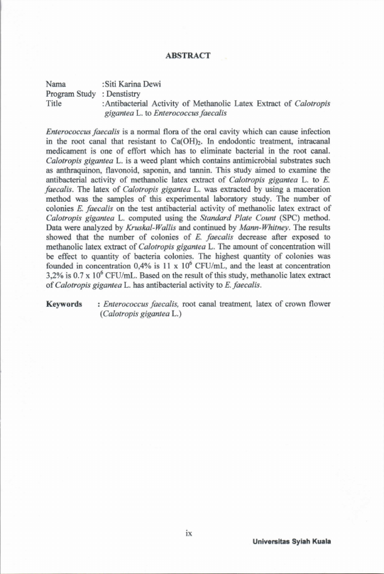 Baca Juga : AKTIVITAS ANTIBAKTERI EKSTRAK METANOL GETAH BIDURI (CALOTROPIS GIGANTEA L.) TERHADAP ENTEROCOCCUS FAECALIS (Siti Karina Dewi, 2015)