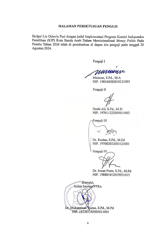 Lia Octavia Pasi, IMPLEMENTASI PROGRAM KOMISI INDEPENDEN PEMILIHAN (KIP) KOTA BANDA ACEH DALAM MEMINIMALISASI MONEY POLITIC PADA PEMILU TAHUN 2024. Banda Aceh Fakultas KIP Pendidikan Pancasila dan Kewarganegaraan,