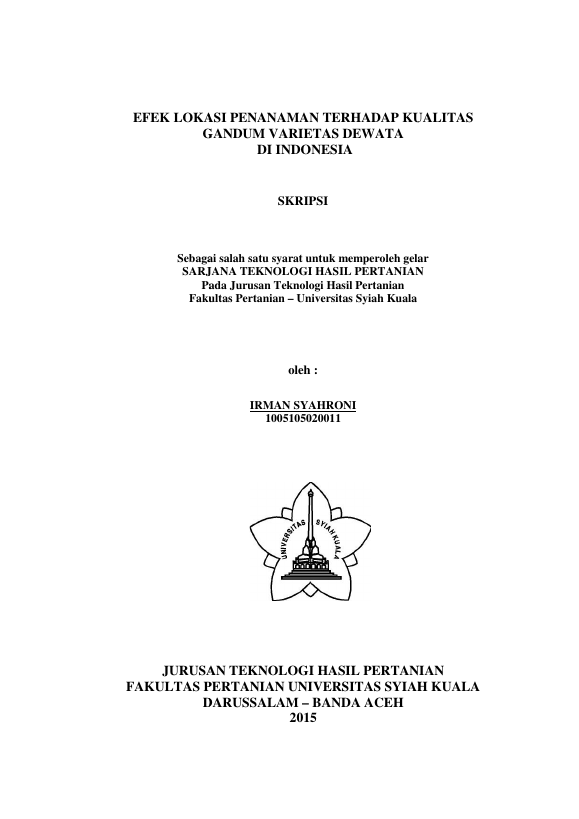 IRMAN SYAHRONI, EFEK LOKASI PENANAMAN TERHADAP KUALITAS GANDUM VARIETAS DEWATA DI INDONESIA. Banda Aceh Fakultas Pertanian,2015