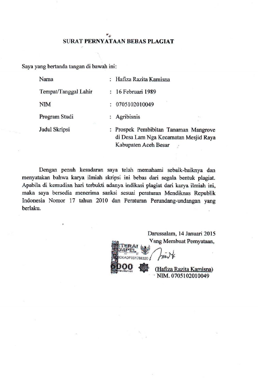 Hafiza Razita Kamisna, PROSPEK USAHA PEMBIBITAN TANAMAN MANGROVE DI DESA LAMNGA KECAMATAN MESJID RAYA KABUPATEN ACEH BESAR. Banda Aceh Fakultas Pertanian,2015