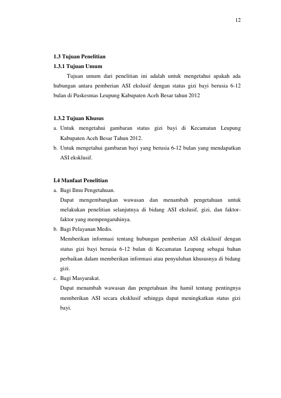 Baca Juga : HUBUNGAN PEMBERIAN MAKANAN PENDAMPING ASI (MP-ASI) DENGAN STATUS GIZI BAYI (6-12 BULAN) DI DESA LAMLAGANG KECAMATAN BANDA RAYA BANDA ACEH TAHUN 2011 (Mifta Amalia, 2013)