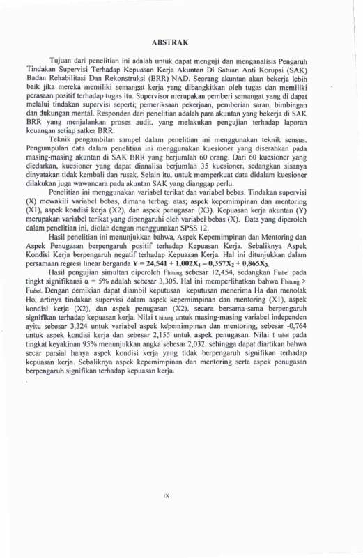Mustika Fitriani, PENGARUH TINDAKAN SUPERVISI TERHADAP KEPUASAN KERJA PADA SATUAN ANTI KORUPSI (SAK) BADAN REHABILITASI DAN REKONSTRUKSI (BRR) NAD. Banda Aceh Fakultas Ekonomi,2008