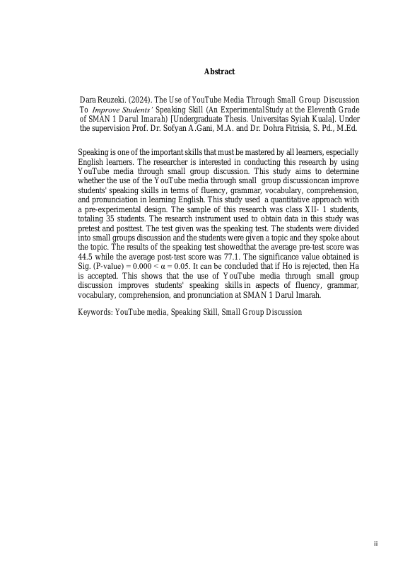 Baca Juga : THE USE OF YOUTUBE VIDEOS AS A MEDIA IN TEACHING SPEAKING (AN EXPERIMENTAL STUDY ON THE SECOND GRADE STUDENTS AT SMAN 8 BANDA ACEH) (FIRATUN AINI, 2019)