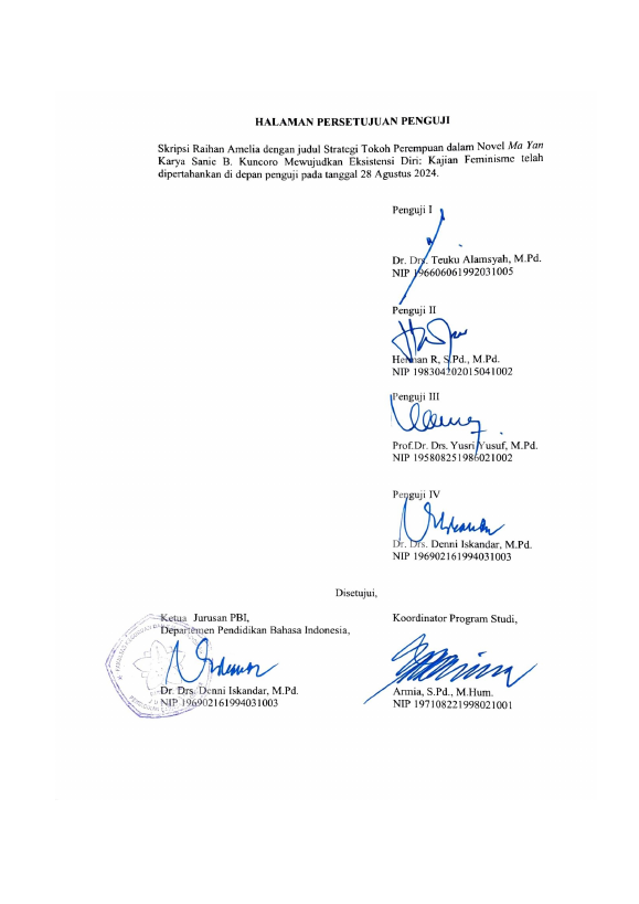 Raihan Amelia, STRATEGI TOKOH PEREMPUAN DALAM NOVEL MA YAN RNKARYA SANIE B. KUNCORO MEWUJUDKAN RNEKSISTENSI DIRI: KAJIAN FEMINISME. Banda Aceh ,2024