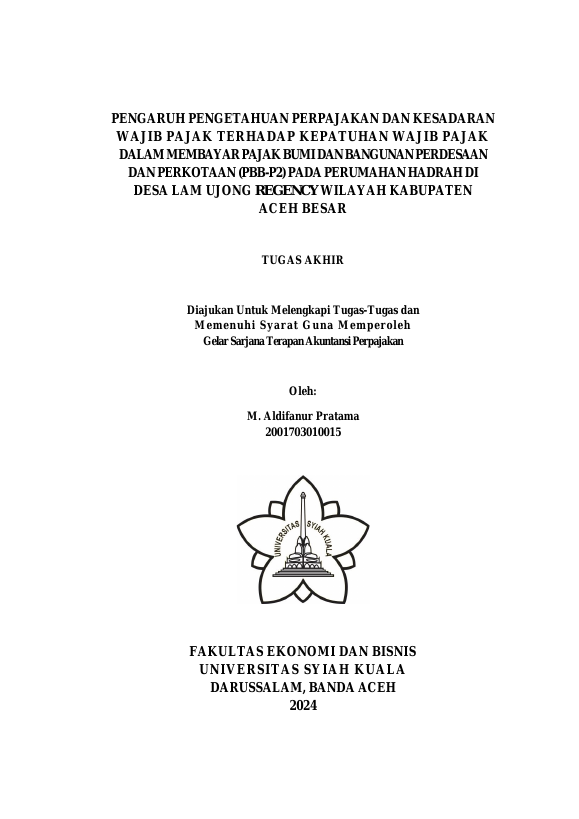 PENGARUH PENGETAHUAN PERPAJAKAN DAN KESADARAN WAJIB PAJAK TERHADAP KEPATUHAN WAJIB PAJAK DALAM MEMBAYAR PAJAK BUMI DAN BANGUNAN PERDESAAN DAN PERKOTAAN (PBB-P2) PADA PERUMAHAN HADRAH DI DESA LAM UJONG REGENCY WILAYAH KABUPATEN ACEH BESAR. Banda Aceh Fakultas Ekonomi dan Bisnis Akuntansi (S1),2024